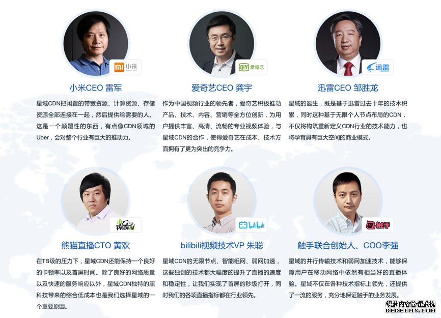 自去年6月至今,星域CDN两大直播新品以业内最顶级直播技术和最低售价,为业内标杆企业给予技术支持并帮助其降低带宽成本,赢得后者公开认可。小米电视掌舵人王川曾赞“星域CDN是直播技术的一次革命”,熊猫直播CTO黄欢称是星域的独特“黑科技”扛起了熊猫直播TB级压力。
