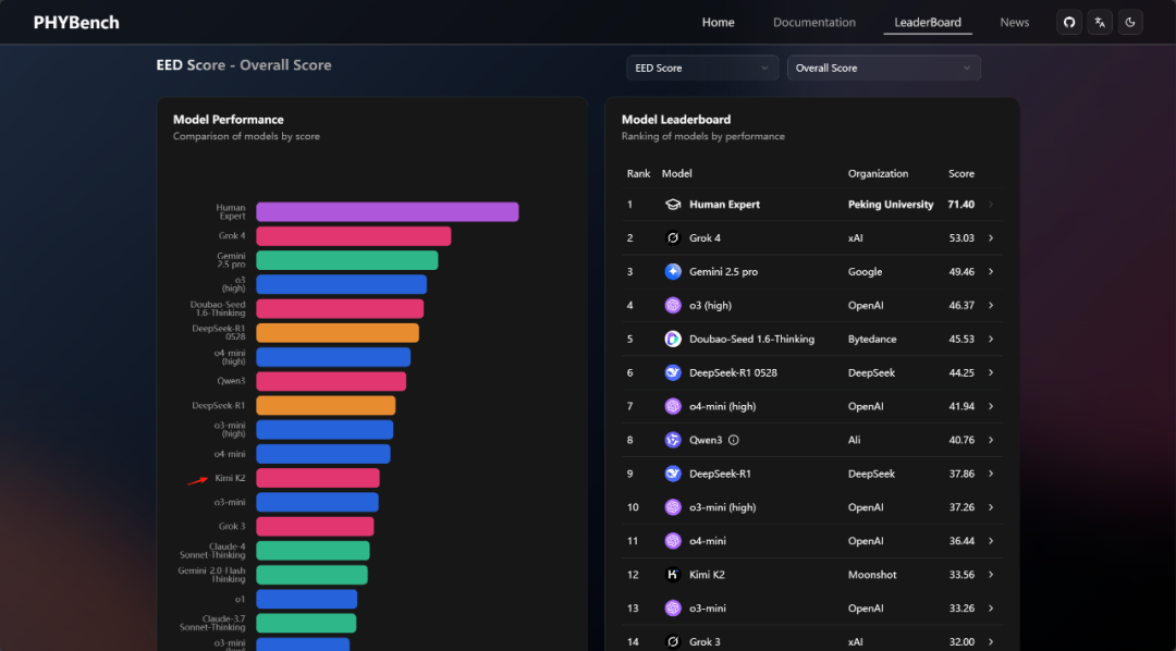 同时,由北京大学开发、用于评估 AI 大语言模型物理推理能力的基准测试项目 PHYBench 里,Kimi K2 在所有非推理模型中排名第一 。