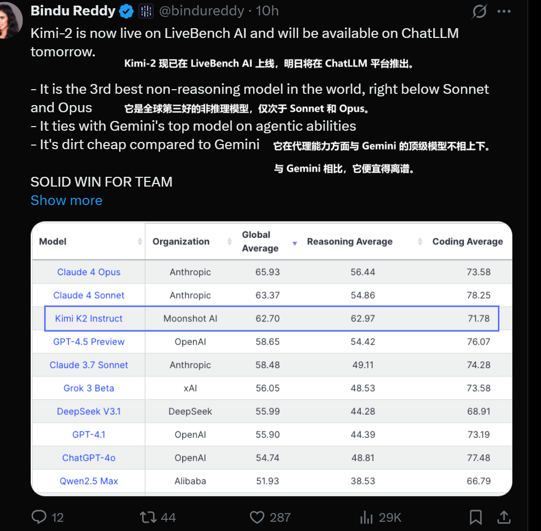 当下写代码时,Claude系列的 3.5、3.7 版本较为常用,主要是因为Claude 4成本偏高。而从数据来看,Kimi K2 表现亮眼,其Global Average达62.70 、Reasoning Average为62.97 、Coding Average是71.78 ,再结合显著的成本优势,有望成为代码场景里极具性价比的选择 。