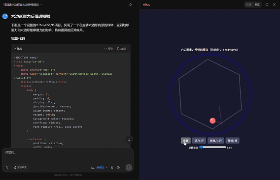 prompt:模拟六边形重力反弹球的真实物理环境