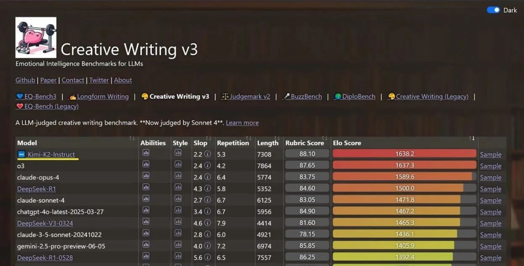 都说Kimi的文本能力是看家本领,其在创意写作测评“Creative Writing v3”中展现超强实力,以Rubric Score(88.10) 、Elo Score(1638.2)的优异成绩登顶榜首 。