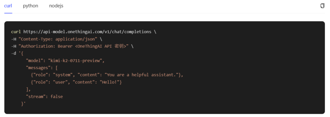 步骤三:给予curl、Python、Node.js三种技术方案,快速接入模型Kimi-K2,满足多样化开发场景及开发者使用习惯。