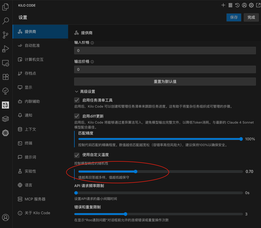 3)在高级选项中配置 temperature 为 0.7(这是 Qwen 官方推荐的参数)
