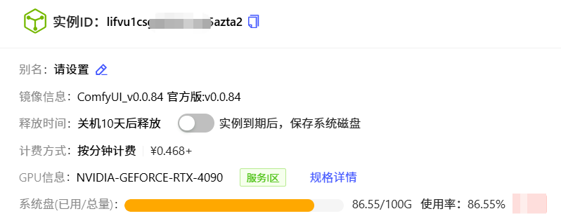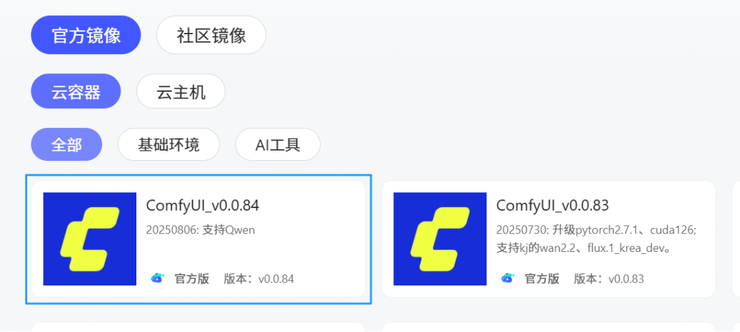 1)选择Ezpay算力云 - 镜像中心给予的“ComfyUl_v0.0.84”快速创建实例。