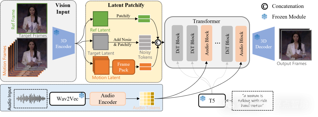据官方透露,此次开源的Wan2.2-S2V可不是只动动嘴皮子的普通模型:手势、表情、姿态都能灵活联动,且完美适配卡通、动物等风格化形象,甚至能稳定生成分钟级长视频,实力相当全面。其在更深层的架构设计层面,还暗藏了不少创新亮点: