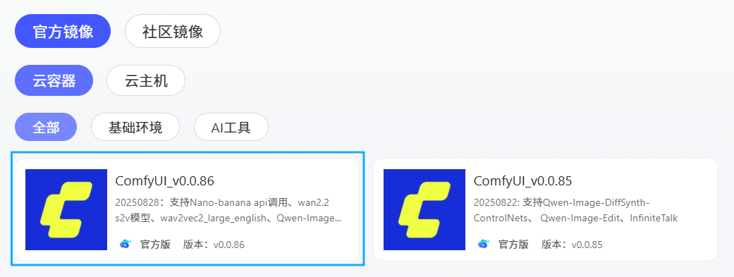 1)登录Ezpay算力云,打开镜像中心并选择“ComfyUl_v0.0.86”快速创建实例。