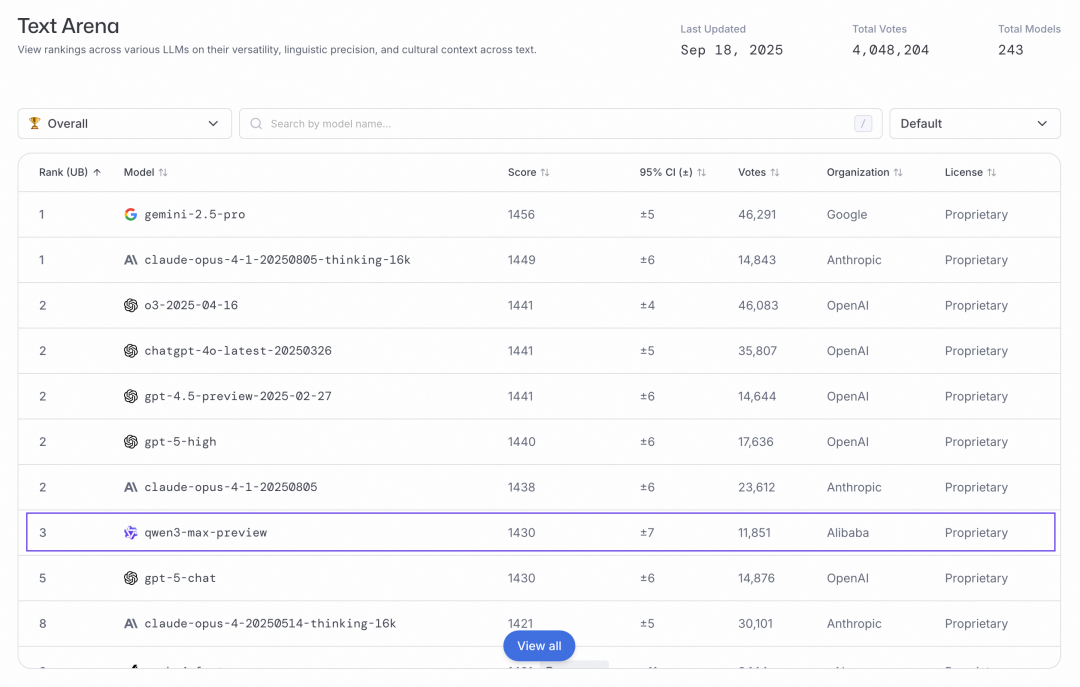 据悉,Qwen3-Max 系列模型是通义千问迄今为止规模最大、能力最强的模型,模型总参数超 1 万亿,给予指令(Instruct)和推理(Thinking)两大版本。其在最权威的 LMArena 文本排行榜上力压GPT-5,进入全球前三: