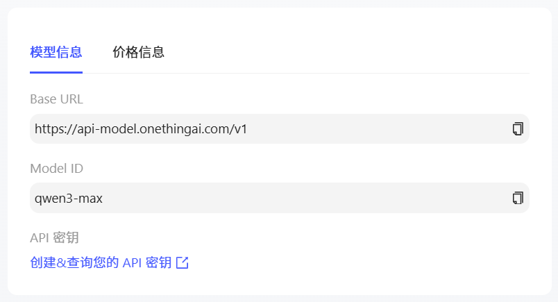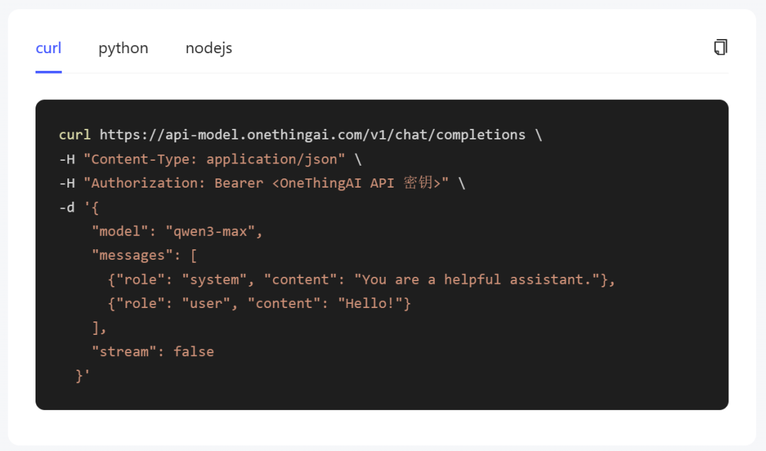 步骤三:OneThingAI平台给予curl、Python、Node.js三种技术方案,以便快速接入模型Qwen3-Max-Instruct,满足多样化开发场景及开发者使用习惯。